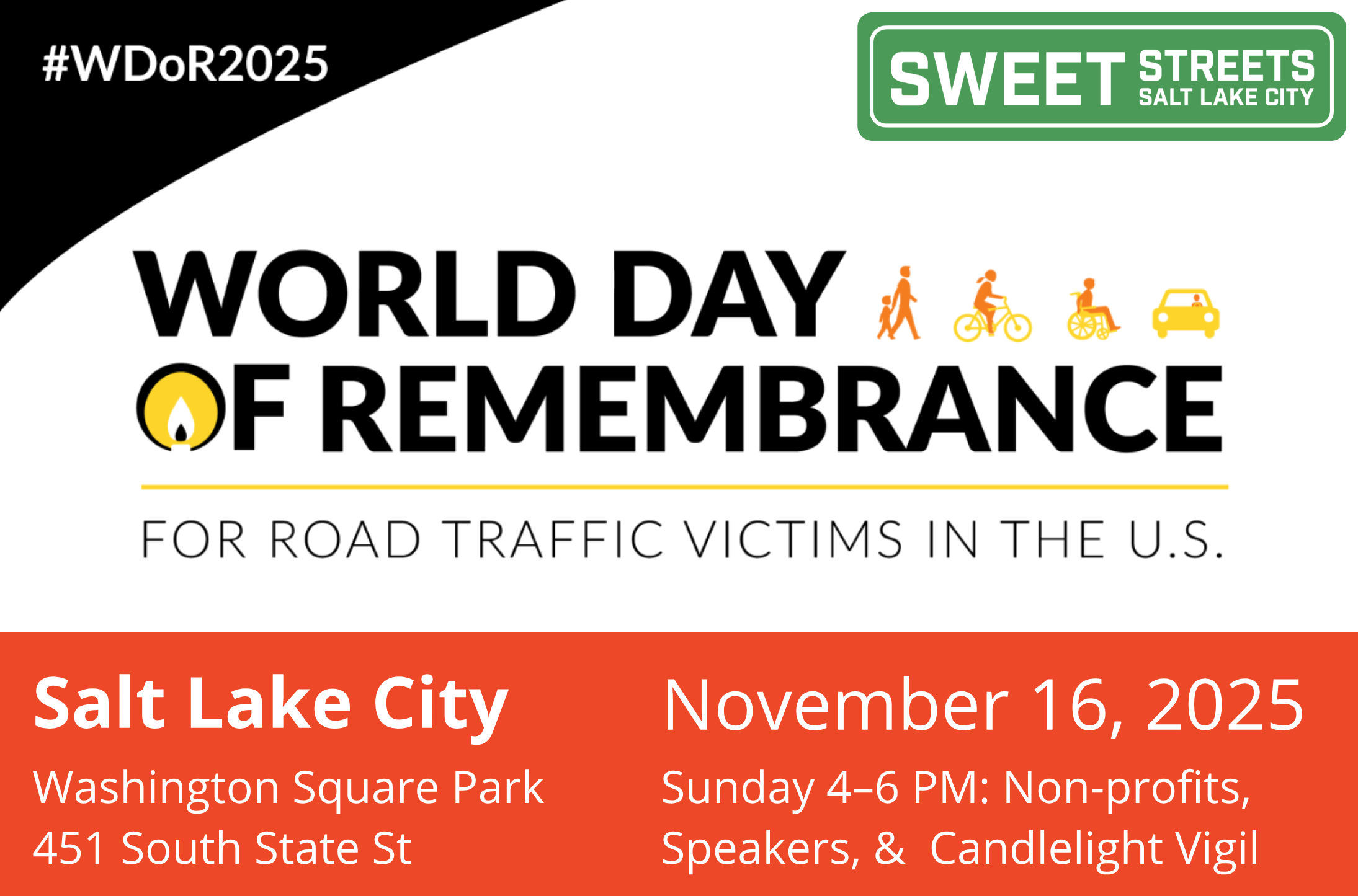 On Sunday, November 16, Salt Lake City will join those across the nation and the globe in the World Day of Remembrance for Road Traffic Victims to honor those who have lost their lives or been impacted by roadway crashes. Held by Sweet Streets, community members will gather to demand action towards improving street safety, hear how traffic violence has impacted our community members, and SLC Transportation will share some of their recent and upcoming work to reduce traffic violence on our streets. The event will include a speaker program, tabling by transportation organizations, and a short walk and candlelight vigil near a recent crash site.